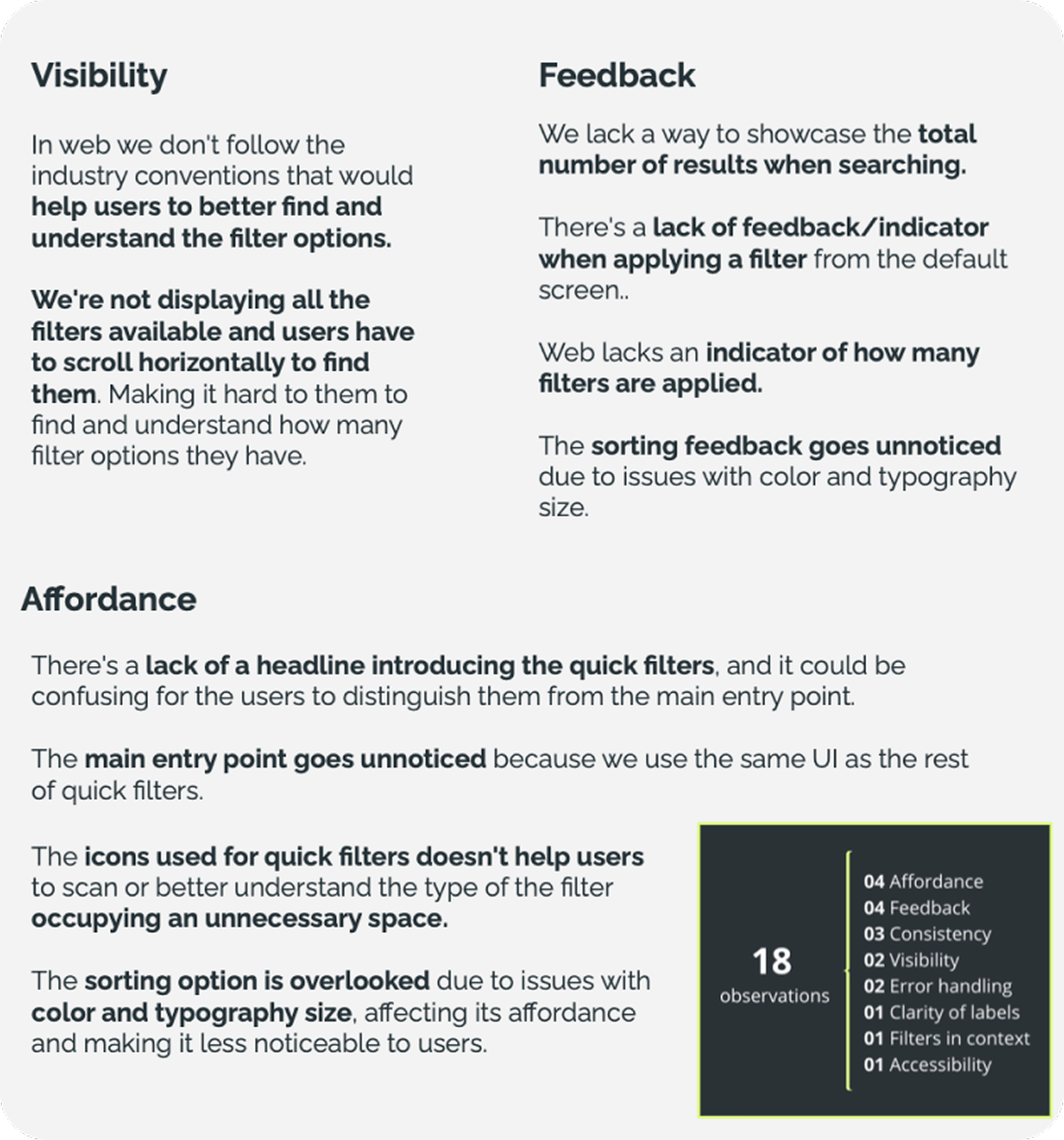 We identified two key Jobs-to-be-Done around accessing and using filters. In this case study, I’ll focus on the first JTBD: accessing filters, while the second was successfully addressed and released (see bellow).